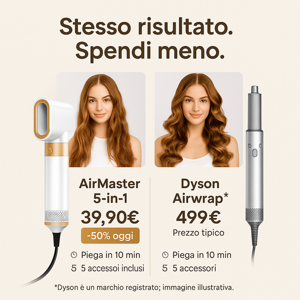 3. Acconciatura perfetta in 10 minuti con 5 accessori inclusi. AirMaster 5-in-1 offre le stesse prestazioni di un dispositivo premium, ma a soli 39,90€. Stile impeccabile, veloce e accessibile, senza rinunciare alla qualità.