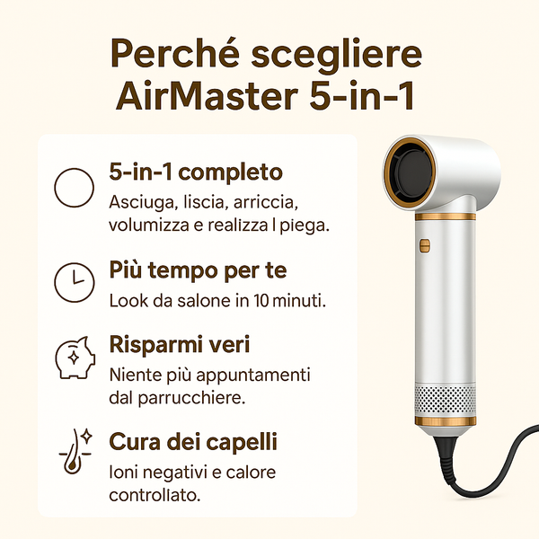 1. Con AirMaster 5-in-1 trasformi la tua routine in un momento di bellezza: asciuga, liscia, arriccia e dona volume in pochi minuti. Risultati da salone senza fatica, senza stress e senza spendere una fortuna.